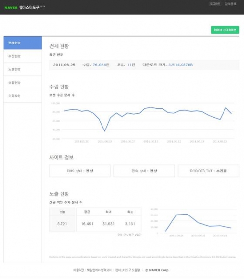 네이버는 검색 결과로 나온 웹페이지의 수집현황을 종합 관리할 수 있는 베타버전의 ‘웹마스터 도구’를 제공한다고 27일 밝혔다.