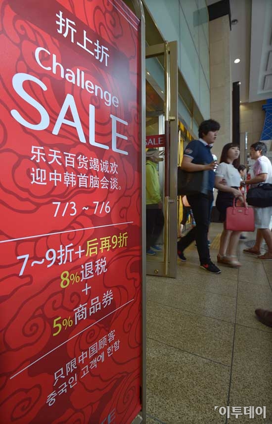 한중 정상회담을 계기로 중국이 경제발전파트너로 관심이 집중되고 있는 가운데 유통업계도 이벤트를 통해 중국 고객 잡기에 나섰다. 3일 오후 서울 중구 롯데백화점 본점에 중국인 고객에 한해 특별 추가할인을 제공한다는 안내문이 붙어 있다. 최유진 기자 strongman55@