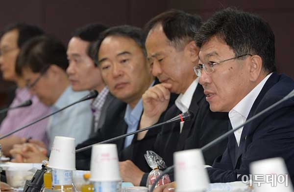 윤상직 산업통상자원부 장관이 4일 오전 서울 종로구 한국무역보험공사에서 열린 정책자문위원회에 참석해 인사말을 하고 있다. 최유진 기자 strongman55@