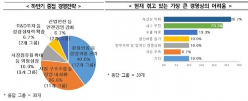 이번 조사에서 30대 그룹은 하반기 역점 경영전략으로 ‘환율변동 등 경영위험 관리(40.0%)’, ‘사업구조조정 등 경영 내실화(36.6%)’를 가장 많이 꼽았다. 이어 ‘시장점유율 확대 등 외형성장(10.0%)’, ‘성장잠재력 확충(6.7%)’, ‘안전경영 강화(6.7%)’ 등 순이었다. 이는 대기업들이 하반기에 외형 성장보다 위험 관리와 내실화에 집중할 것을 시사한 것으로 풀이된다.