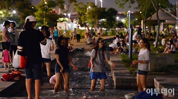 서울과 경기남부·서부, 강원영서남부 등 19개 시·군에 폭염주의보가 내려지고 열대야까지 이어진 10일 서울 여의도 한강시민공원을 찾은 시민들이 물장난을 하며 더위를 식히고 있다. 최유진 기자 strongman55@
