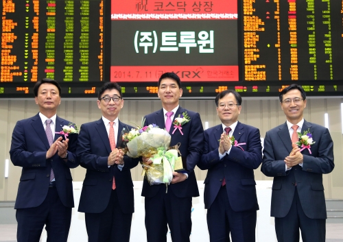 한국거래소 코스닥시장본부는 11일 서울사옥 홍보관에서 자동차 악셀페달센서 등 자동차부품 제조업체인 트루윈의 코스닥시장 상장기념식을 개최했다. 상장 기념패 전달 후 강홍기 한국IR협회 부회장(왼쪽부터), 주익수 하나대투증권 IB부문대표, 남용현 트루윈 대표이사, 김재준 한국거래소 코스닥시장본부장, 김원식 코스닥협회 부회장이 기념촬영을 하고 있다.