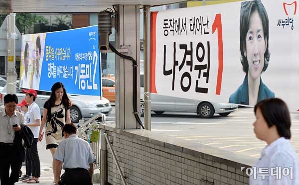 7·30 재보궐선거 최대 격전지인 서울 동작을 후보들이 공식 선거운동에 돌입했다. 17일 오전 서울 동작구 사당역에 출마자들의 홍보현수막이 내걸려 있다. 최유진 기자 strongman55@