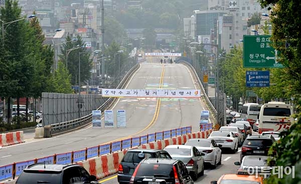 서울 중구 동호로 약수고가차도가 20일 철거에 들어가면서 차량통행이 통제되고 있다. 약수고가는 1984년 12월 설치돼 서울 강남과 강북을 오가는 차량이 이용해왔지만 도시 미관을 저해하고 약수사거리 일대의 상권을 침체시킨다는 지적도 이어졌다. 최유진 기자 strongman55@