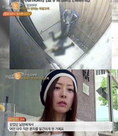 24일 공개된 mbc 시사프로그램 '리얼스토리 눈'에서는 지난 5월 10일 서울 강남구 청담동의 한 오피스탈 지하주차장에서 서세원이 서정희를 폭행하는 장면이 담겨 있는 CCTV 영상이 공개됐다. 서세원이 서정희와 지하 주차장에서 이야기를 나누던 중 서세원이 CCTV의 사각지대인 요가실로 이동해 폭행하는 장면이었다. 특히 서세원은 서정희의 다리를 잡은 채 엘레베이터로 질질 끌고가는 장면까지 전파를 타 충격을 줬다.
