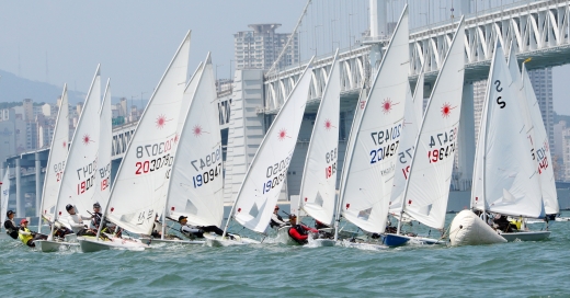 27일 오전 부산 해운대구 수영만요트경기장 앞바다에서 열린 '제15회 부산시장기 전국요트경기대회'에 참가한 선수들이 바람을 이용해 바다를 질주하고 있다.