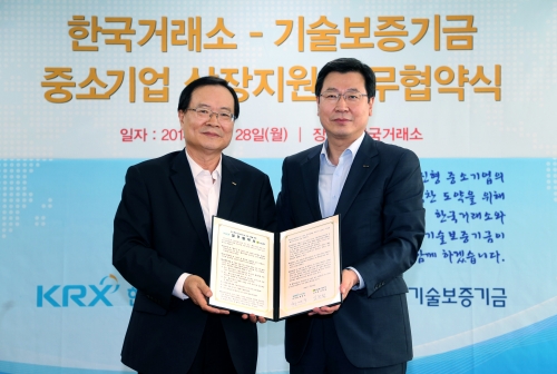 한국거래소와 기술보증기금은 28일 오후 3시 서울 여의도 거래소 사옥에서 기술혁신형 우량 중소·벤처기업 등의 상장지원을 위한 업무협약을 체결했다.