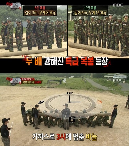 조교는 12인용 목봉을 든 채 시계바늘 방향대로 움직이는 훈련을 진행했다. 12인용 목봉을 든 멤버들은 움직이는 것 조차 힘들어하며 무게를 견디며 훈련에 임했다.