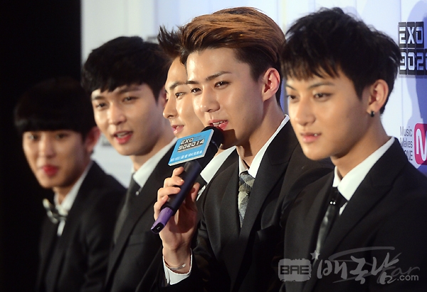 Mnet ‘K-POP 타임슬립’ EXO 902014 기자간담회가 11일 오전 마포구 상암동 CJ E&M에서 열렸다. 기자간담회에 참석한 EXO의 세훈이 취재진의 질문에 답하고 있다.