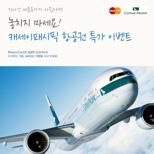 삼성 마스타카드는 오는 31일까지 단 2주 동안 삼성 마스타카드 이용 고객을 위해 프리미엄 항공사 캐세이패시픽의 일반석 왕복항공권 특가 프로모션을 진행한다.