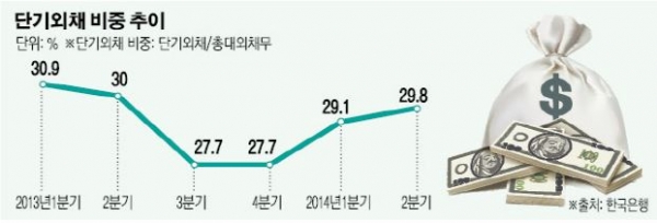 이중 단기외채는 전분기보다 80억달러 늘어난 1318억달러로 조사됐다. 이에 따라 전체 대외채무 중 단기외채가 차지하는 비중은 29.8%로 전분기보다 0.7%포인트 상승했다. 단기외채 비중은 2013년 6월(30.0%) 이후 최고 수준이다.
