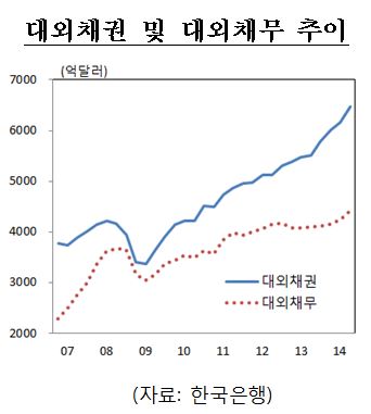 전체 대외채권은 6478억달러로 3개월 전과 비교해 314억달러 증가했다. 이로써 대외채권(6478억달러)에서 대외채무(4422억달러)를 차감한 순대외채권은 2056억달러로 전분기에 비해 145억달러 늘었다.