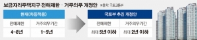 국토부는 전매제한을 최대 5년 이하로, 거주의무기간도 최대 2년 이하로 낮추는 방안을 검토중이다. 또 옛 보금자리주택지구내 민영아파트의 전매제한도 현행 2∼5년에서 대폭 낮추는 방안을 논의중이다. 강남ㆍ서초 등 강남권 보금자리주택지구와 위례신도시 등지의 공공주택 당첨자들도 전매기관과 거주의무기간이 축소돼 크게 혜택을 볼 수 있을 전망이다.