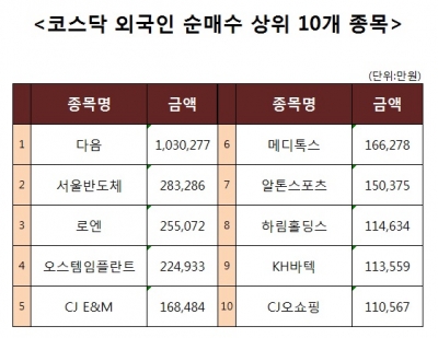 [코스닥 외국인 순매수 상위 10개 종목]