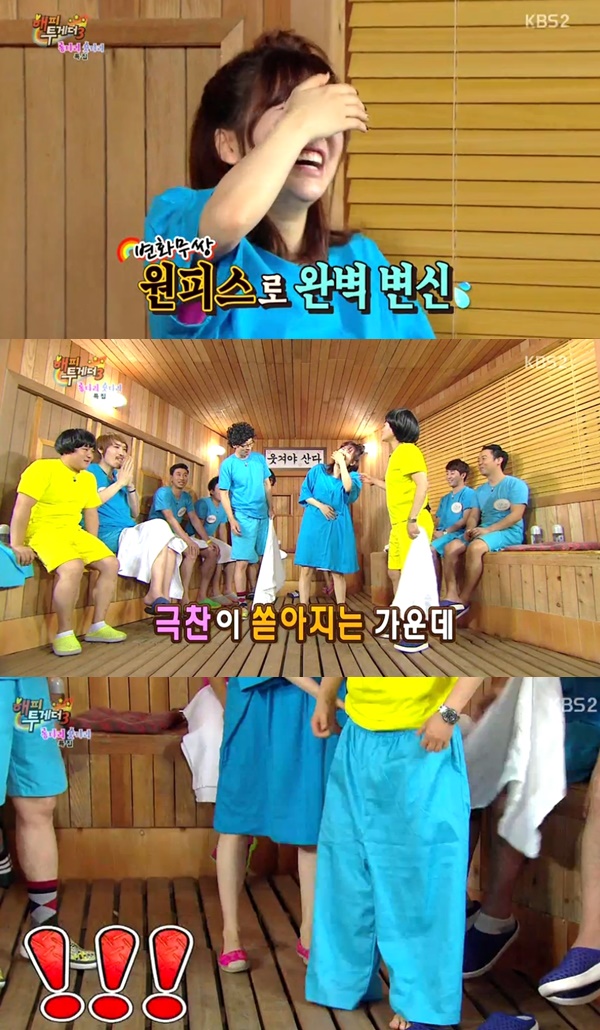 이날 ‘해피투게더’에서 소녀시대 써니는 유재석 등의 권유로 최홍만의 티셔츠를 입었다. 써니가 입자, 최홍만의 티셔츠는 원피스가 됐다. 이를 본 유재석 등은 “너무 깜찍하고 귀엽다”며 환호했다.