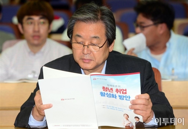 김무성 새누리당 대표가 29일 오전 여의도 국회 의원회관에서 (재)여의도연구원 주최로 열린 청년 취업 활성화 방안 정책토론회에 참석해 관련 책자를 살펴보고 있다. 이날 열린 토론회에서는 우수 강소기업 소개 및 방문 프로그램과 협동조합으로의 공동창업 방안과 고급 숙련인력 양성 프로그램을 논의한다. 노진환 기자 myfixer@