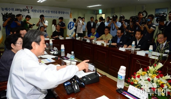 김무성 새누리당 대표가 29일 오전 노량진 수산시장에서 가진 시장 종사자와의 간담회에서 인사말을 하고 있다. 이날 새누리당 김무성 대표와 농해수위 위원들은 노량진 수산시장을 현장 방문해 수산물 물가 및 시장 동향을 점검하고 현장의 의견을 수렴했다. 노진환 기자 myfixer@