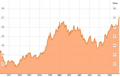 ▲달러.루블 환율 1년간 추이. 1일(현지시간) 37.5루블. 블룸버그
