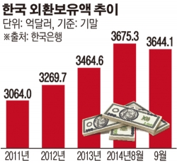 외환보유액은 지난해 7월(329억7000만달러)부터 올 7월까지 13개월째 사상 최고치를 경신해 왔다. 그러나 지난 8월부터 두달 연속으로 내림세를 나타냈다. 이는 유럽연합의 유로화, 영국의 파운드화 등의 약세로 인해 이들 통화표시 자산의 미 달러화 환산액이 감소했기 때문이다. 9월 중 달러화 대비 유로화 가치는 3.7%, 파운드화 가치는 2.1% 각각 하락했다.