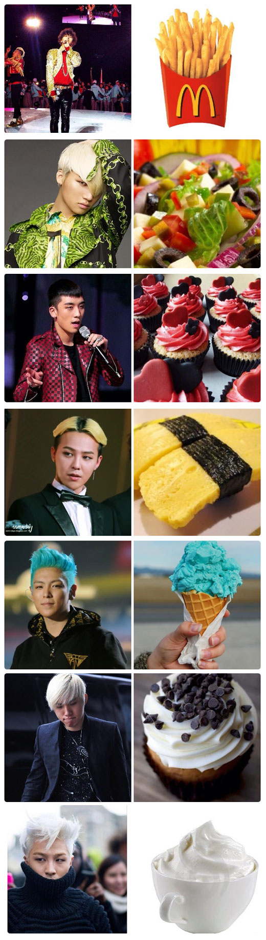 빅뱅을 보면 무엇이 떠오르시나요? 멋진 무대? 화려한 패션? 파격적인 스타일? 최근 SNS상에서 '음식이 빅뱅을 생각나게 한다'는 빅뱅과 음식(Big Bang and Foods) 계정이 화제입니다. 빅뱅 멤버들의 옷이나 헤어스타일과 비슷한 음식 사진을 올리며 사람들의 관심을 받고 있는데요. 빅뱅과 닮은 싱크로율로 네티즌들의 눈길을 사로잡는 음식들을 한번 보실까요?