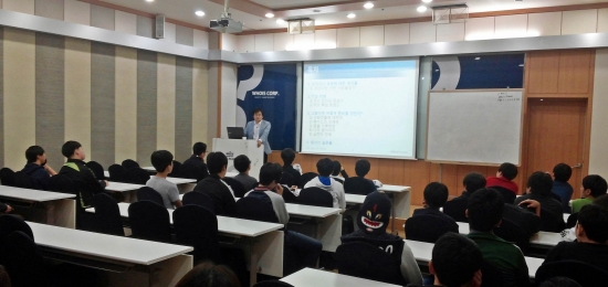 ▲후이즈 이청종 회장이 지난 8일 서울 구로구 후이즈 아카데미 교육센터에서 우신중학교 학생 약 50명을 대상으로 ‘청소년의 꿈과 미래’를 주제로 강연을 진행하고 있다.(사진=후이즈)
