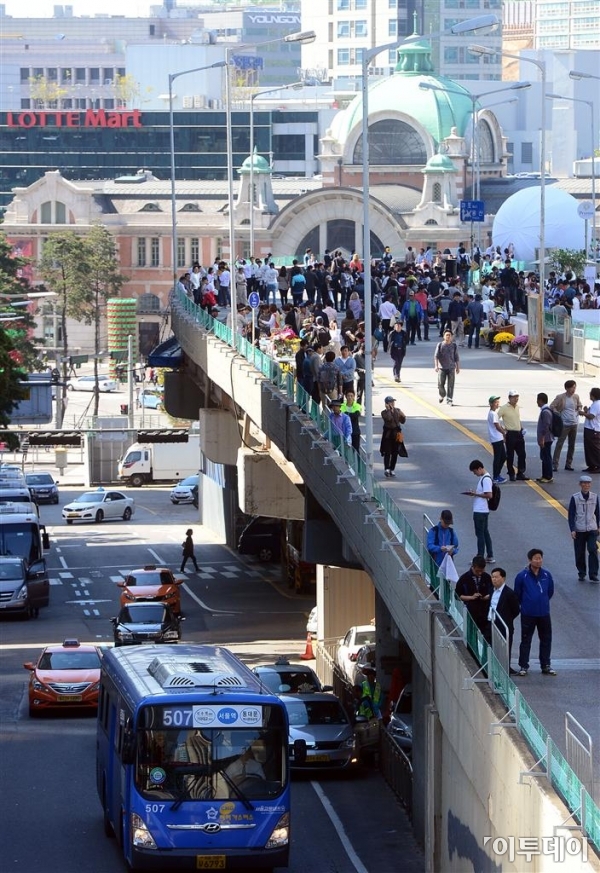 서울역 고가가 12일 오후 44년 만에 일반에 공개됐다. 서울시는 이날 오후 서울역 고가의 차량통행을 차단하고 시민들이 자유롭게 고가를 거닐 수 있도록 ‘시민개방행사’를 진행했다. 서울역 고가 개방 행사는 남대문시장 입구 지하철 회현역 5, 6번 출입구 앞 횡단보도부터 만리동 램프 끝까지 약 1㎞ 구간(폭 10m)에서 열렸다. 이날 오후 시민들이 고가도로를 거닐고 있다. 노진환 기자 myfixer@