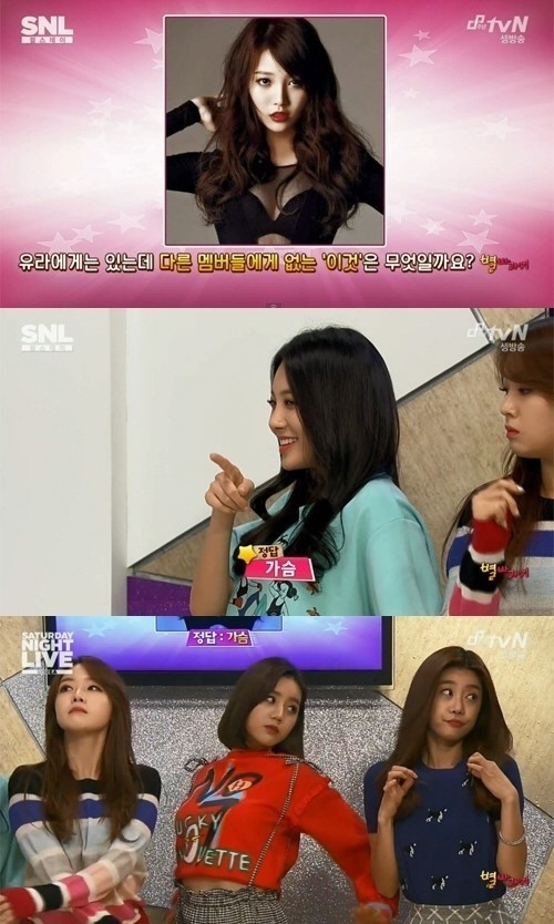 이어 "유라에게는 있는데 다른 멤버들에게 없는 것은?"이란 문제에 유세윤은 "가슴"이라고 외쳤다. 이에 혜리를 제외한 모든 멤버들은 가슴을 응시했고, 혜리는 이에 지지 않기 위해 가슴을 힘껏 내밀어 폭소를 자아내게 했다.