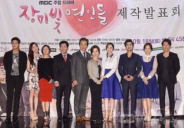 MBC 새 주말드라마 '장미빛 연인들' 제작발표회에서 배우들이 무대 위에서 서있다. 13일 서울 상암동 MBC 상암신사옥 골든마우스홀에서 열린 '장미빛 연인들' 제작발표회엔 윤재문 PD, 이장우, 한선화, 이미숙, 박상원, 정보석, 임예진, 김민서, 한지상, 윤아정, 최필립 등이 참석했다.
