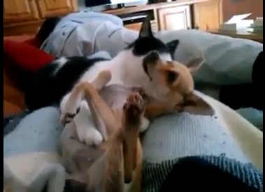 고양이와 강아지의 거침없는 애정행각을 담은 동영상이 화제다. 14일 포털사이트 다음에는 ‘거침없는 애정표현, 아이고야’라는 제목의 영상이 공개됐다. 영상에는 고양이와 개가 등장하는데, 고양이는 연신 개의 귀 아랫부분을 핥고 있다. 네티즌들은 고양이의 이런 행동에 놀란 듯 가만히 있는 개의 모습이 귀엽다는 반응이다.