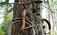 나무에 박힌 자전거…주인 기다리며 녹슬어