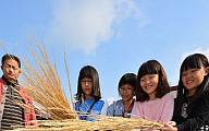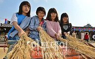 [포토]중양절 맞아 벼 탈곡 체험하는 어린이들