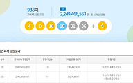 로또 938회 당첨번호 1등 ‘4, 8, 10, 16, 31, 36번…보너스 9번’ “1등 당첨자 10명, 당첨금 22억!”